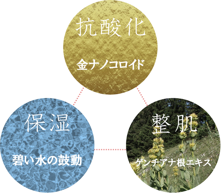「金ナノコロイド」「碧い水の鼓動」「ゲンチアナ根エキス」の三つの主成分が抗酸化・保湿・整肌の作用で理想の肌へ導きます。